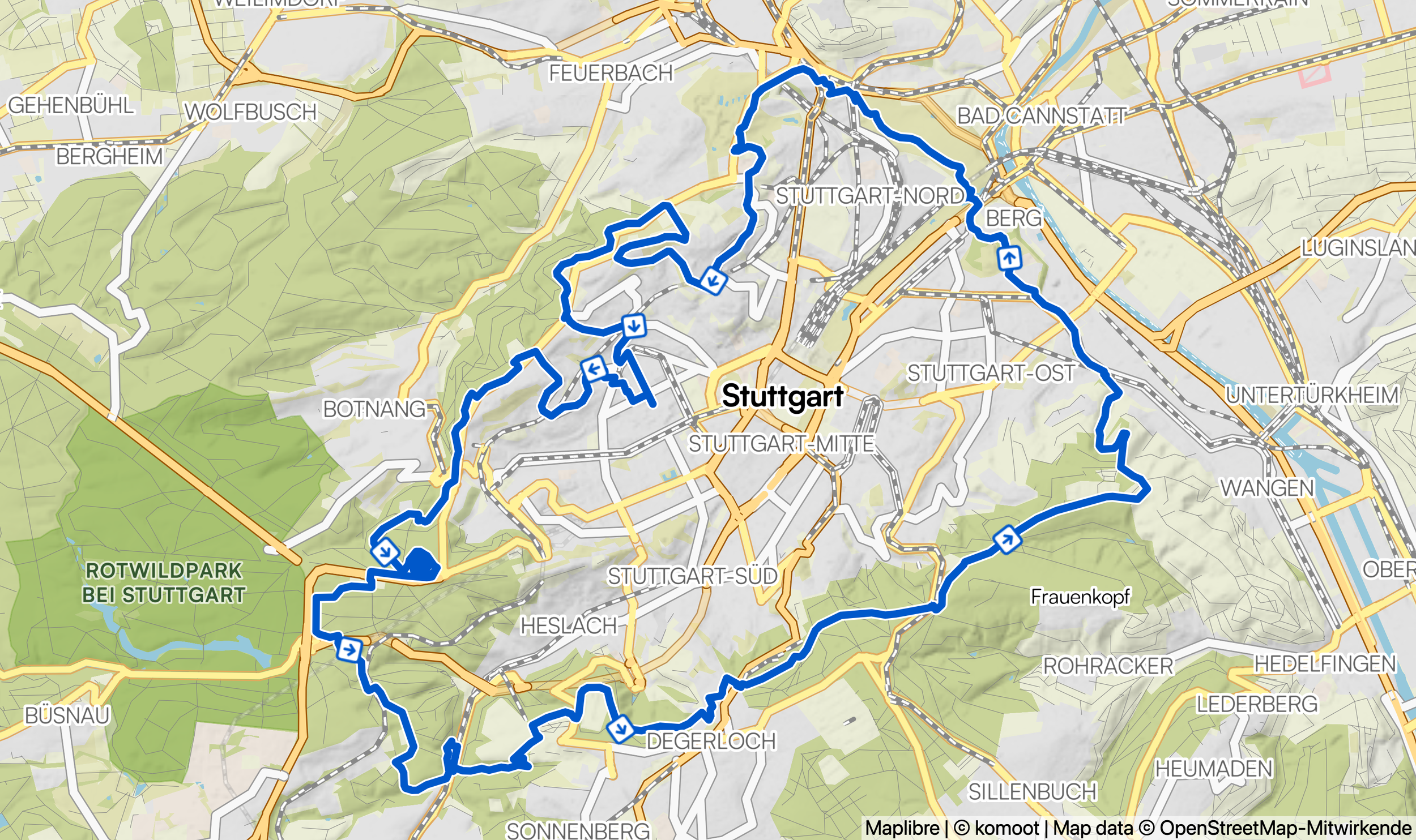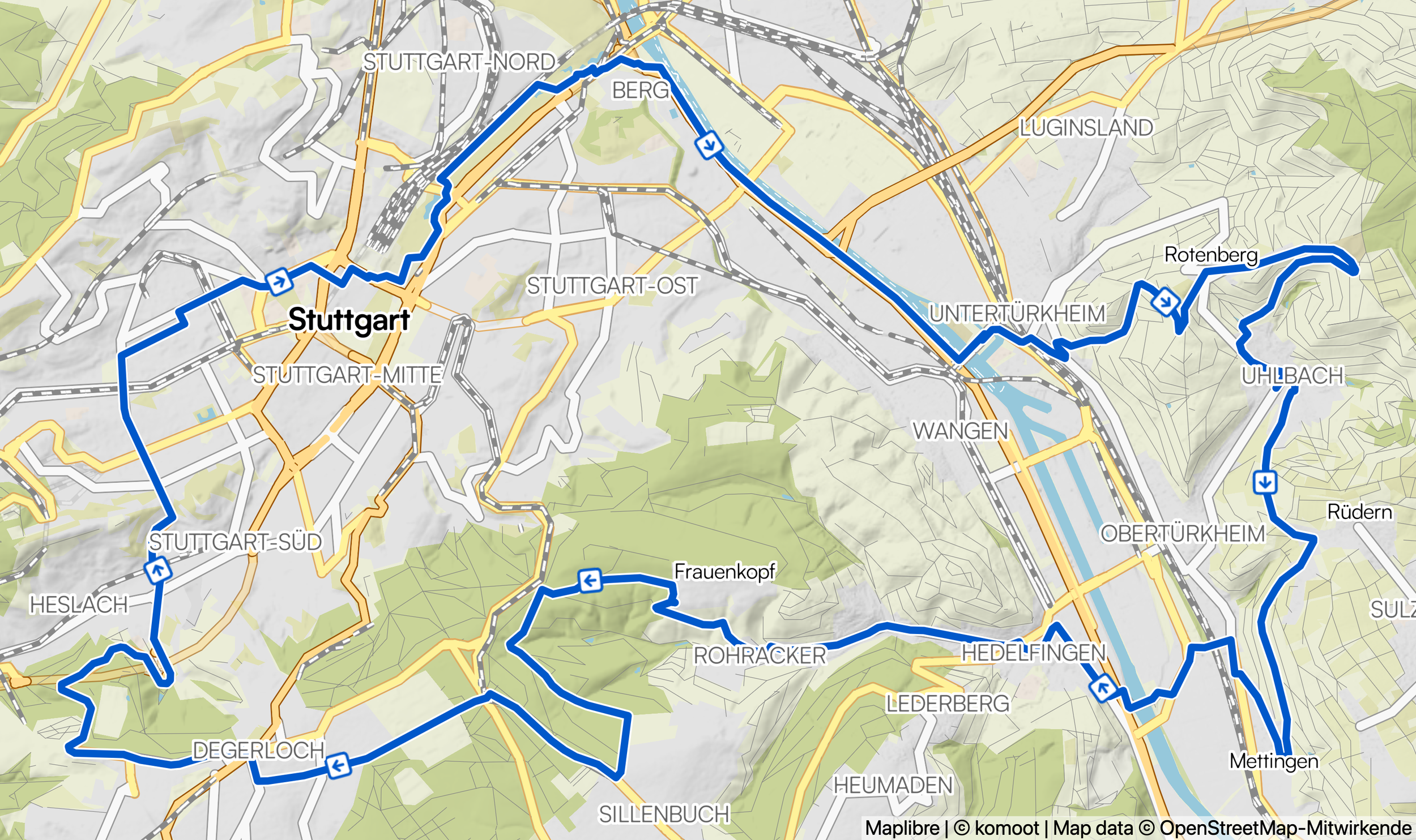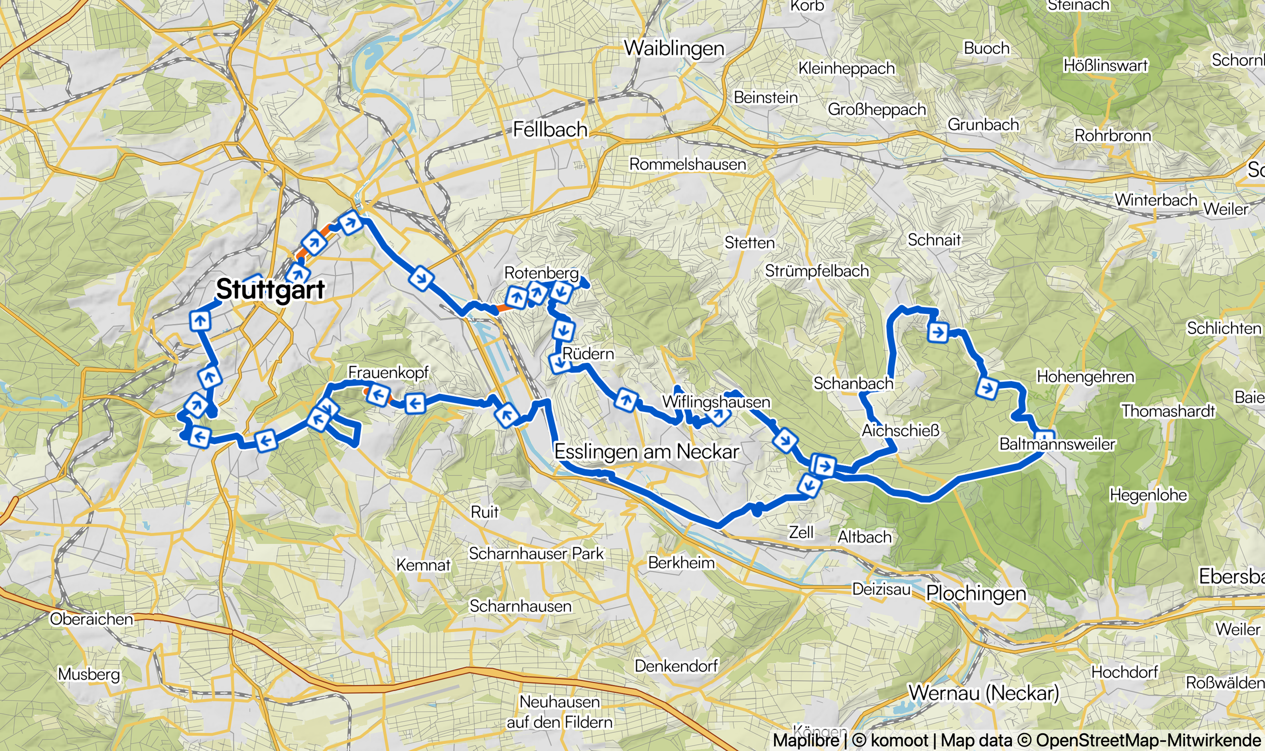 Wie bei der kurzen Tour geht es über die Stuttgarter Klassiker Rotenberg und Frauenkopf. Dazwischen sammelst du noch ein paar Kilometer und weitere Höhenmeter im wunderschönen Schurwald!