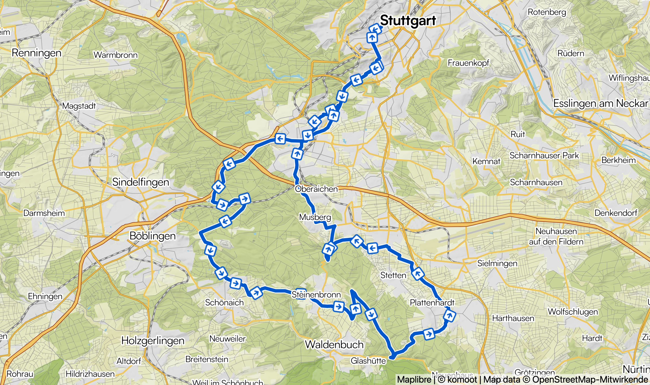 Auch hier geht es über Kaltental raus aus der Stadt und dann in Richtung Schönbuch. In einem Schlenker über das Maurener Tal, Hildrizhausen und über den Golfplatz führt euch die Strecke über Stetten auf den Fildern zurück in die Stadt zum Fietsen.
